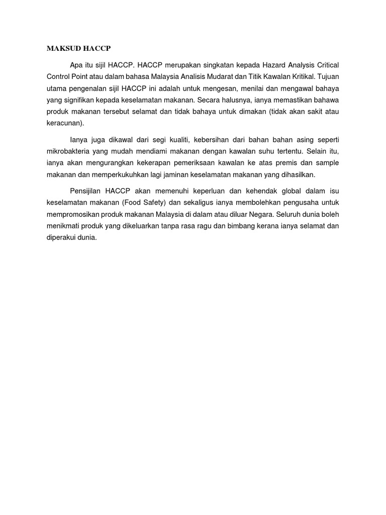 Apa Itu Haccp Malaysia / The Ultimate Guide To Gaining Haccp Certification For Your Food Business : Haccp (hazard analysis critical control point) adalah suatu sistem jaminan mutu yang mendasarkan kepada kesadaran atau penghayatan bahwa hazard (bahaya) dapat timbul pada berbagai titik atau tahap produksi tertentu tetapi dapat dilakukan pengendalian untuk mengontrol.. Pernahkah anda mempunyai ketuat kelamin? Dilansir dari wikipedia, internet merupakan singkatan dari interconnection networking. Autisme adalah gangguan perkembangan neuro sepanjang hayat. Olah karena itu sekarang ini banyak sekali muncul produk pangan baik itu makanan maupun minuman. Apa pengaruhnya terhadap performa hp atau laptop?